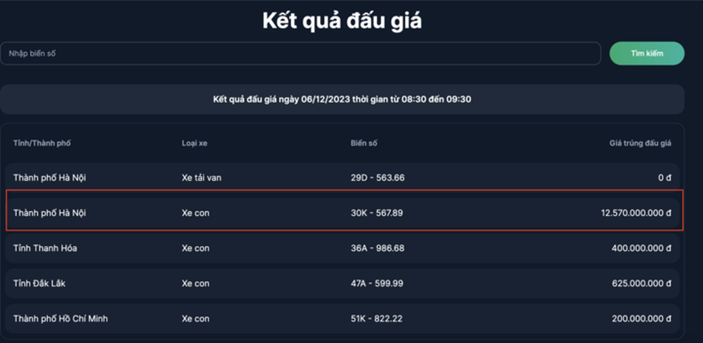 Thời sự Lần thứ 3 đưa ra đấu giá, biển số ‘siêu VIP’ 30K-567.89 được chốt hơn 12 tỉ Tuyến Phan 06/12/2023 11:08 GMT+7 Trong lần thứ ba đưa ra đấu giá, biển số ‘siêu VIP’ 30K-567.89 của Hà Nội vừa được một đại gia chốt giá hơn 12 tỉ đồng. Sáng 6.12, Công ty […]