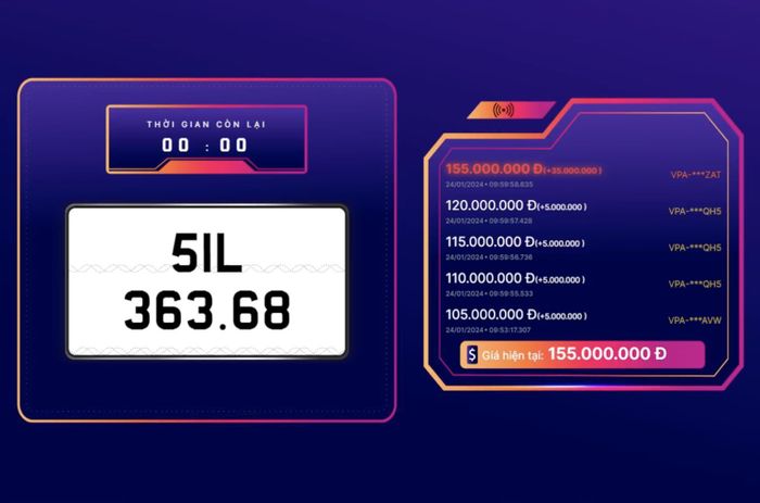 Biển số trúng giá cao nhất trong phiên đấu buổi sáng là 51L-363.68 của TP.HCM với mức giá 155 triệu đồng. Đây là biển số có đuôi “68” mang ý nghĩa lộc phát, nhưng không được đánh giá cao. Trong khi đó, một biển số khác cũng của TP.HCM là 51L-368.86 được cho là đẹp hơn, chỉ có 140 triệu đồng.